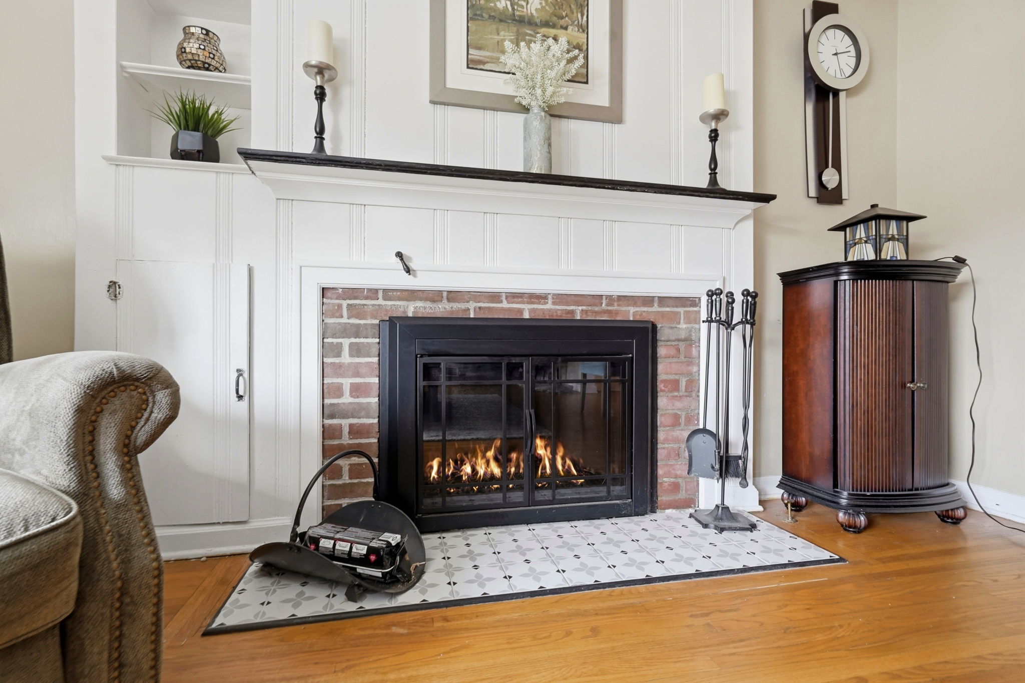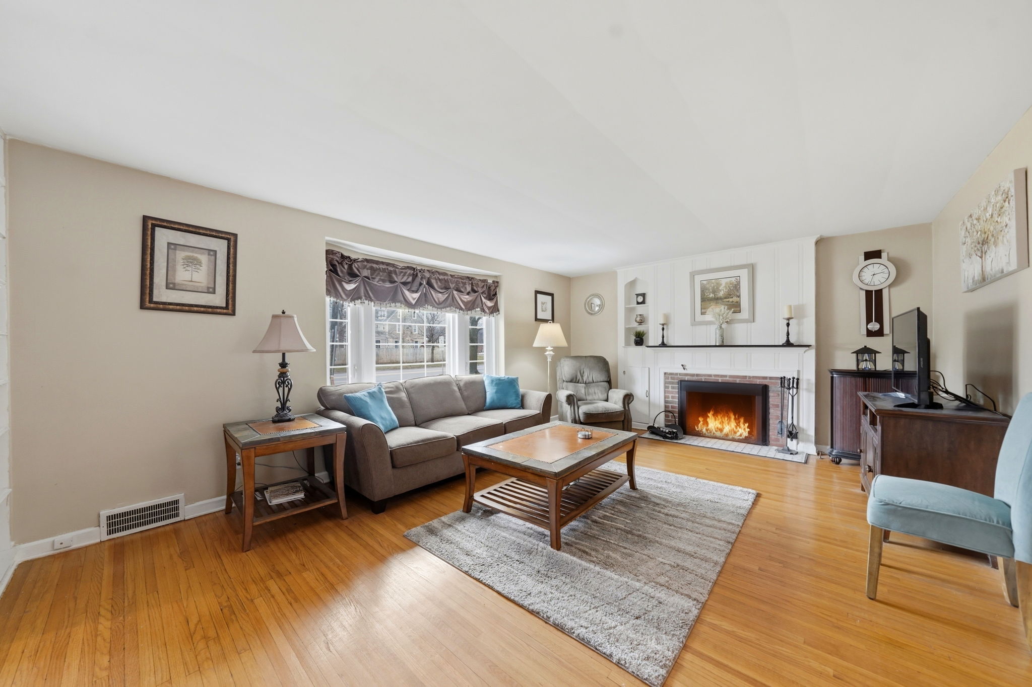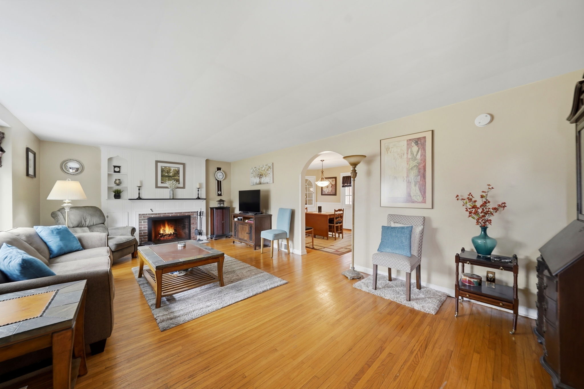 - Interior Features: Smooth walls, many updated windows, a fireplace, built in bookshelves, period moldings and restored hardwood floors.