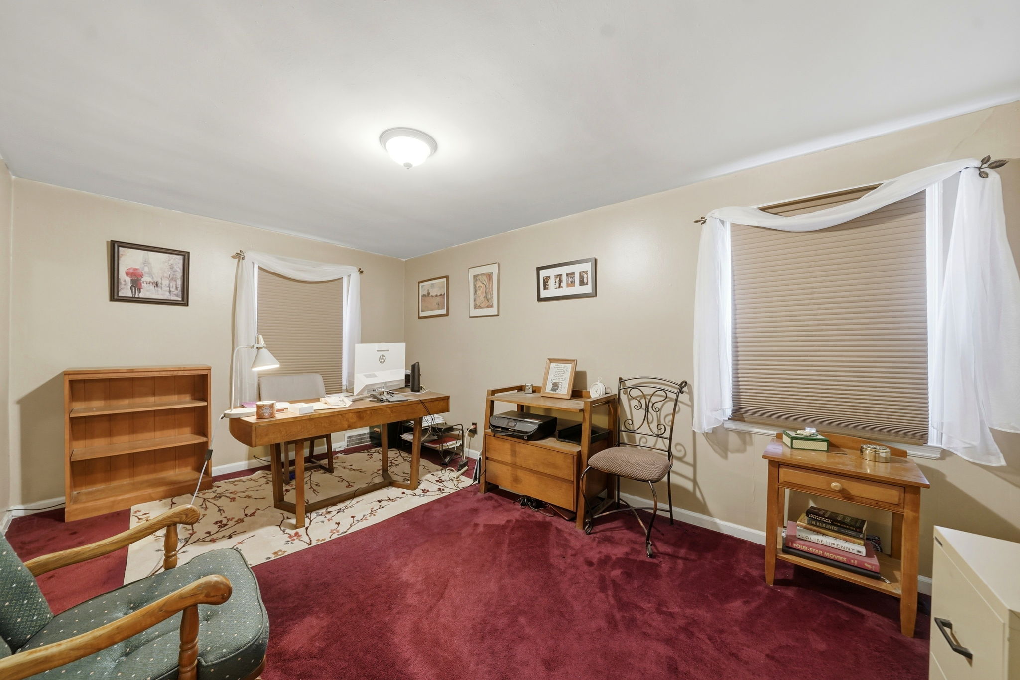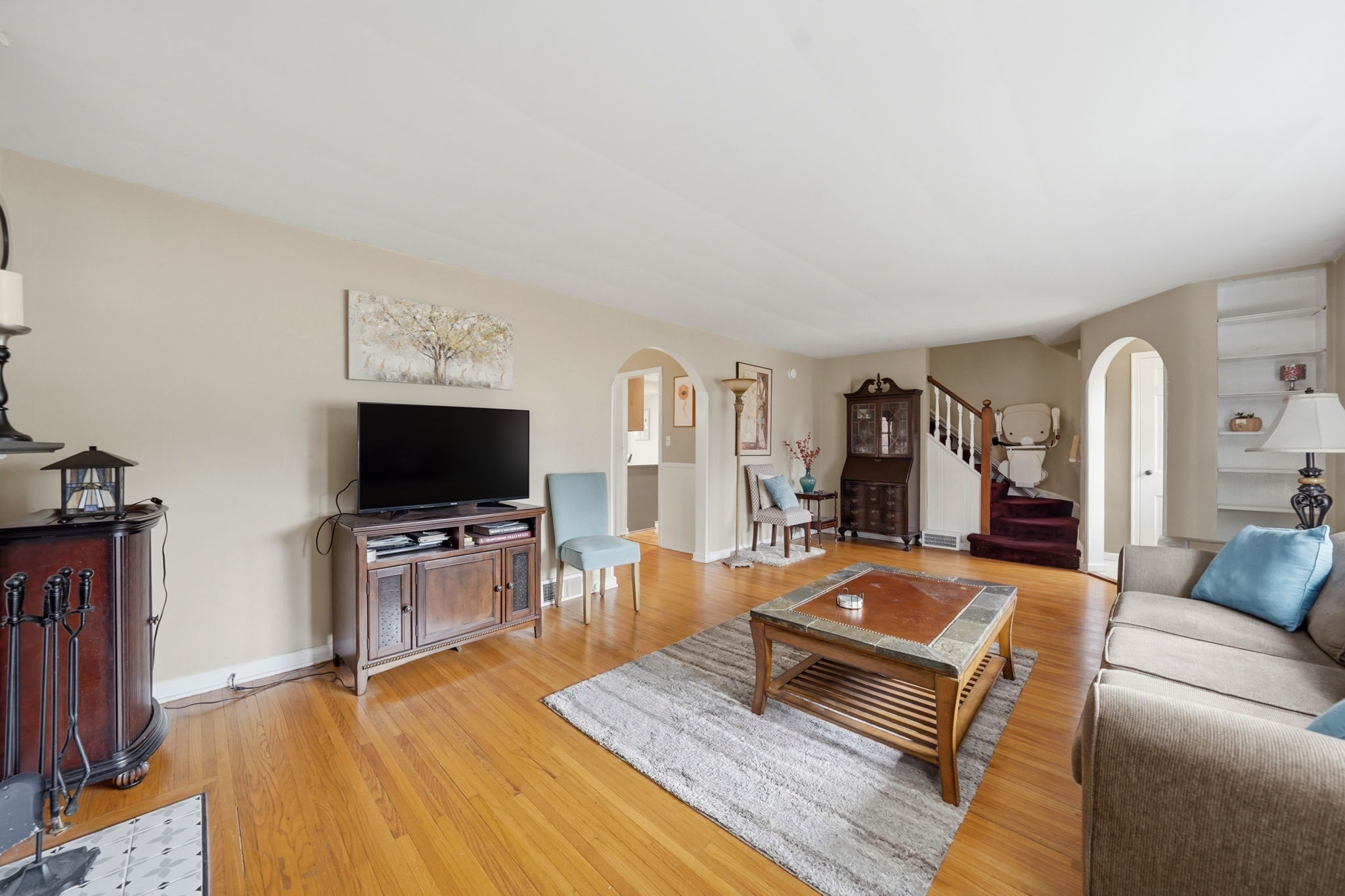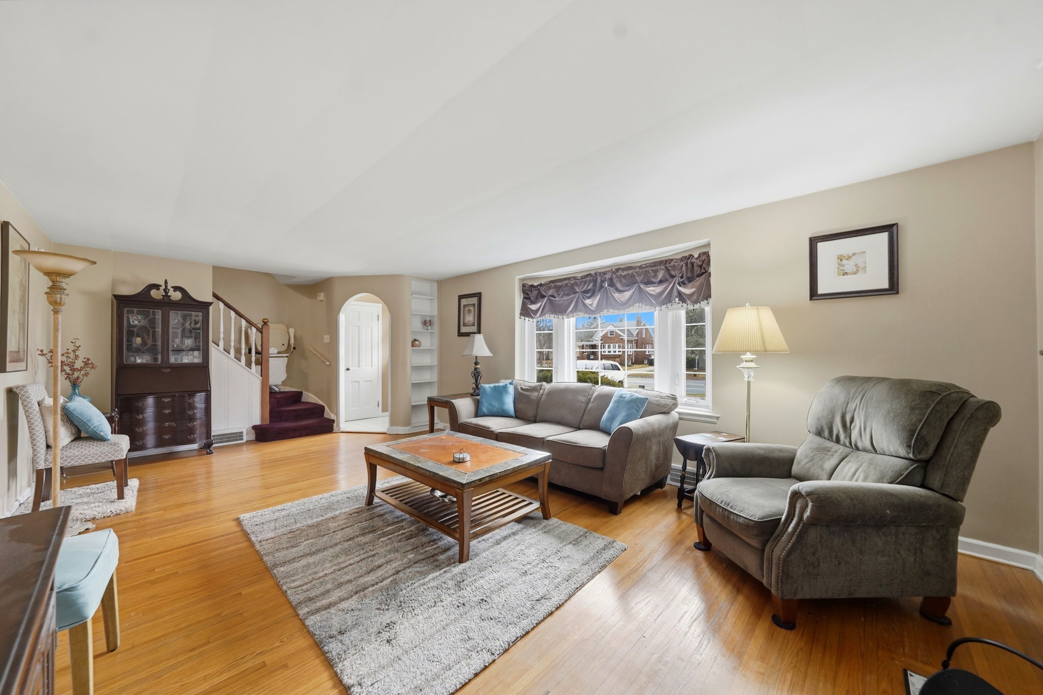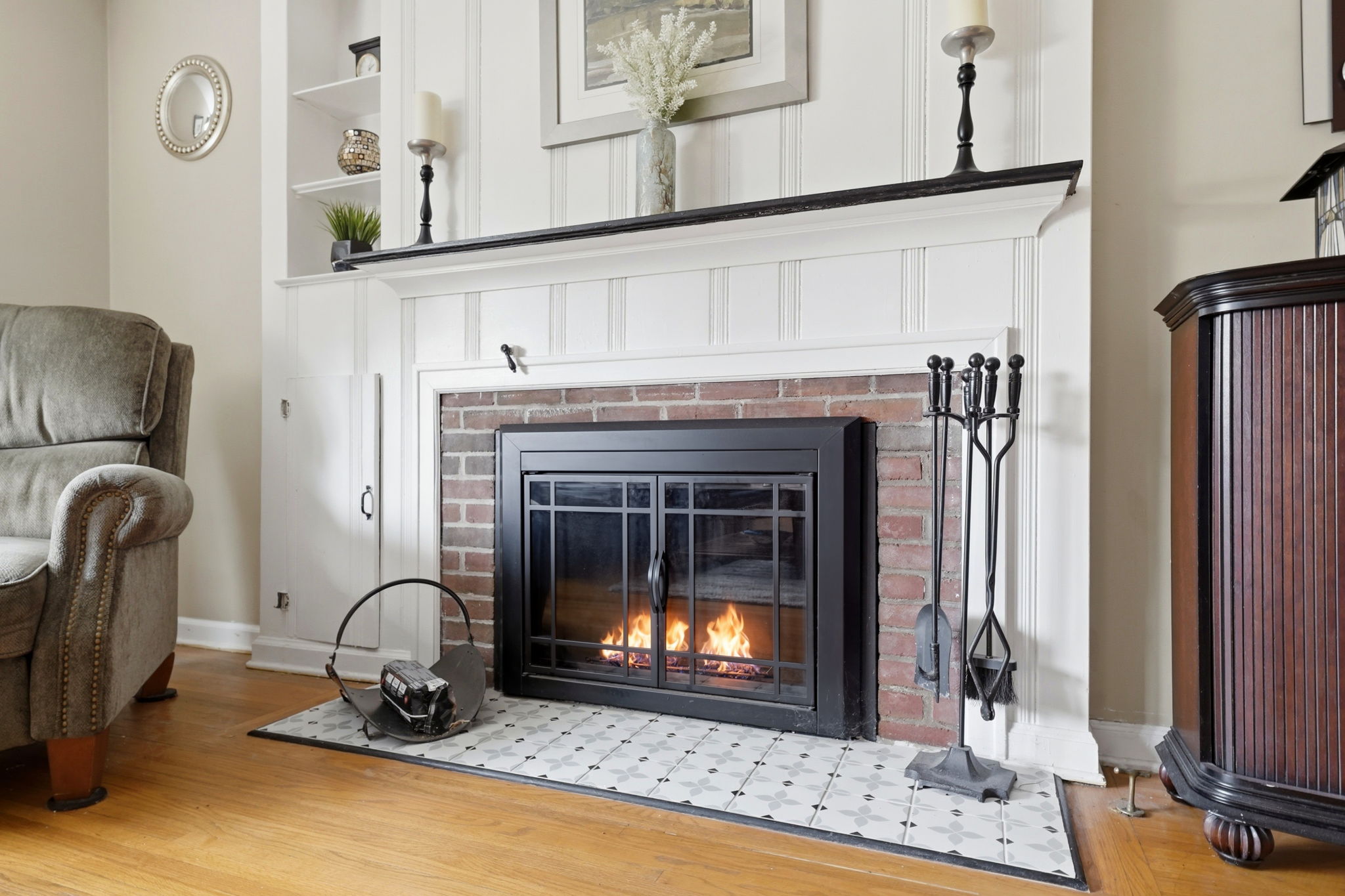 - Interior Features: Smooth walls, many updated windows, a fireplace, built in bookshelves, period moldings and restored hardwood floors.